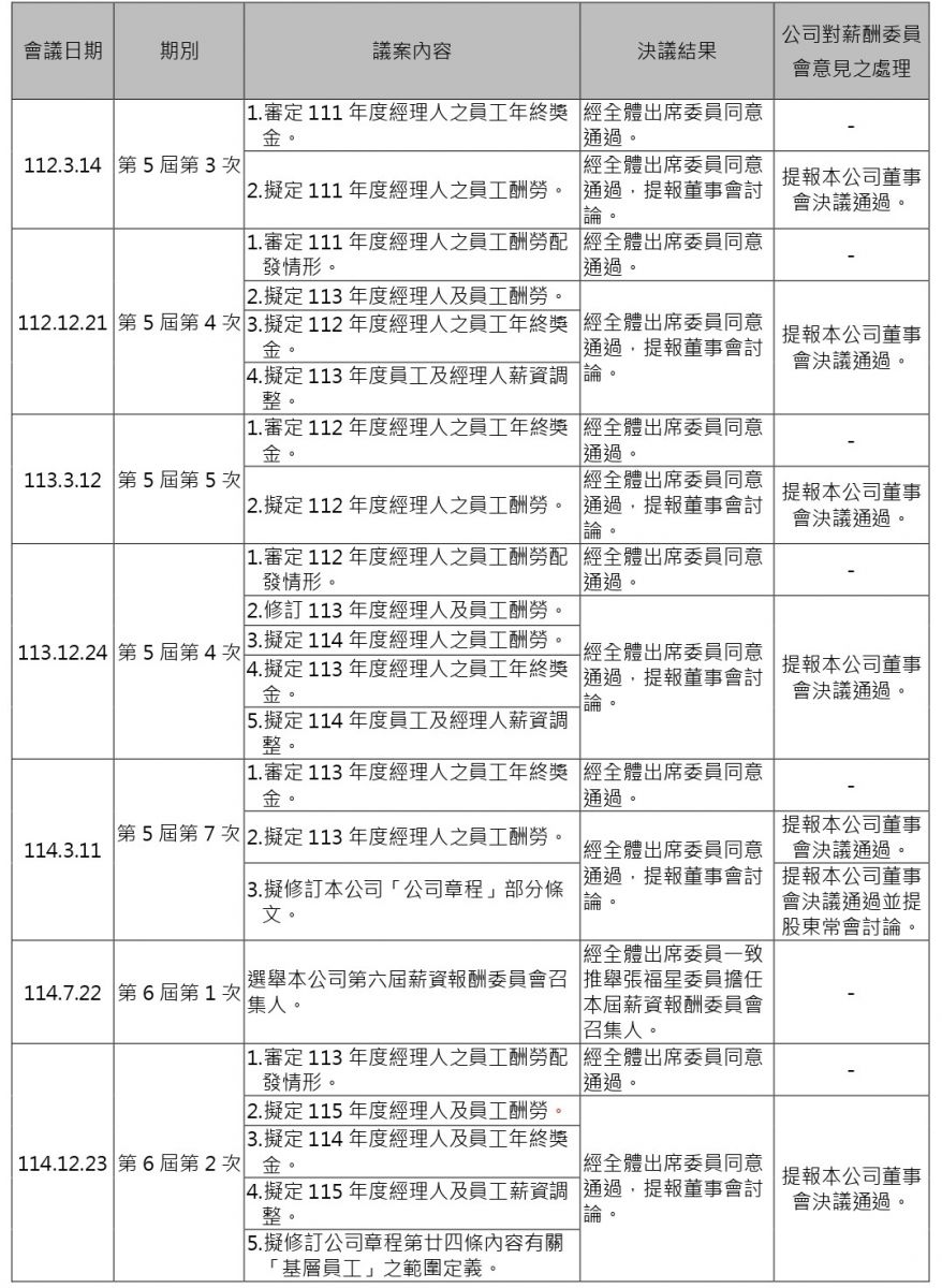 本公司「薪資報酬委員會」職司訂定並定期檢討評估本公司董事及經理人績效評估與薪資報酬之政策、制度、標準與結構及其所領之酬金,並將所提建議提交董事會討論。薪資報酬委員會每年至少召開二次。配合2025年董事會改選,董事會於2025年7月22日通過委任3位獨立董事擔任第6屆薪資報酬委員會委員,並由張福星先生擔任召集人,2025年共召開3次會議,全體出席率達100%(含委託出席)。有關本委員會會議召開情形及每位委員的出席率資訊,請參考本公司各年度年報。