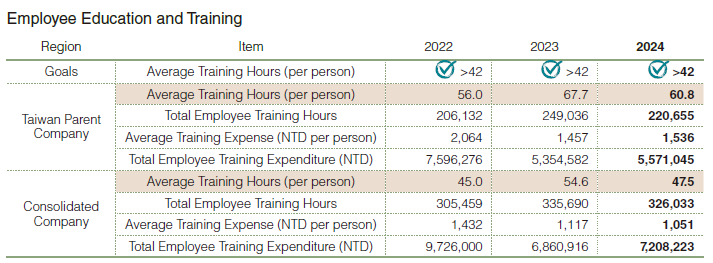 A minimum learning hour threshold was established for mandatory and supplementary professional training to encourage employees to enhance their competencies. In 2024, the Taiwan Parent Company recorded a total of 220,655 learning hours (including E-Learning), with an average of 60.8 hours per person. The Consolidated Company reached 326,033 total training hours, averaging 47.5 hours per person. In 2024, 24 in-person courses were conducted across 47 sessions in the Taiwan area, totaling 219.5 hours and 1,878 participants, both reaching record highs.