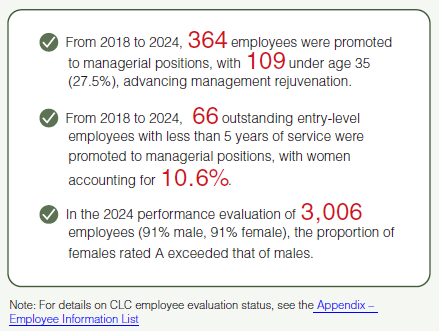 CLC conducts annual performance evaluations for employees with over 1 year of service, including reinstated staff. New employees are assessed under a separate evaluation system. All assessments are conducted without gender bias. Rewards are determined based on individual performance ratings and annual operating results.