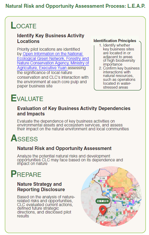 CLC adopted the TNFD Version 1.0 frameworks and initiated an internal L.E.A.P. analysis to comprehensively assess its dependence and impact on natural resources. CLC integrated industry, government, and academia resources to conduct natural capital and biodiversity research projects at its plants, strengthening risk management and corporate resilience. Beginning in 2025, CLC will disclose in accordance with the TNFD frameworks, focusing on governance, strategy, risk management, and metrics to ensure business operations are aligned with environmental sustainability, and will collaborate with industry partners to advance sustainable economic and environmental development.