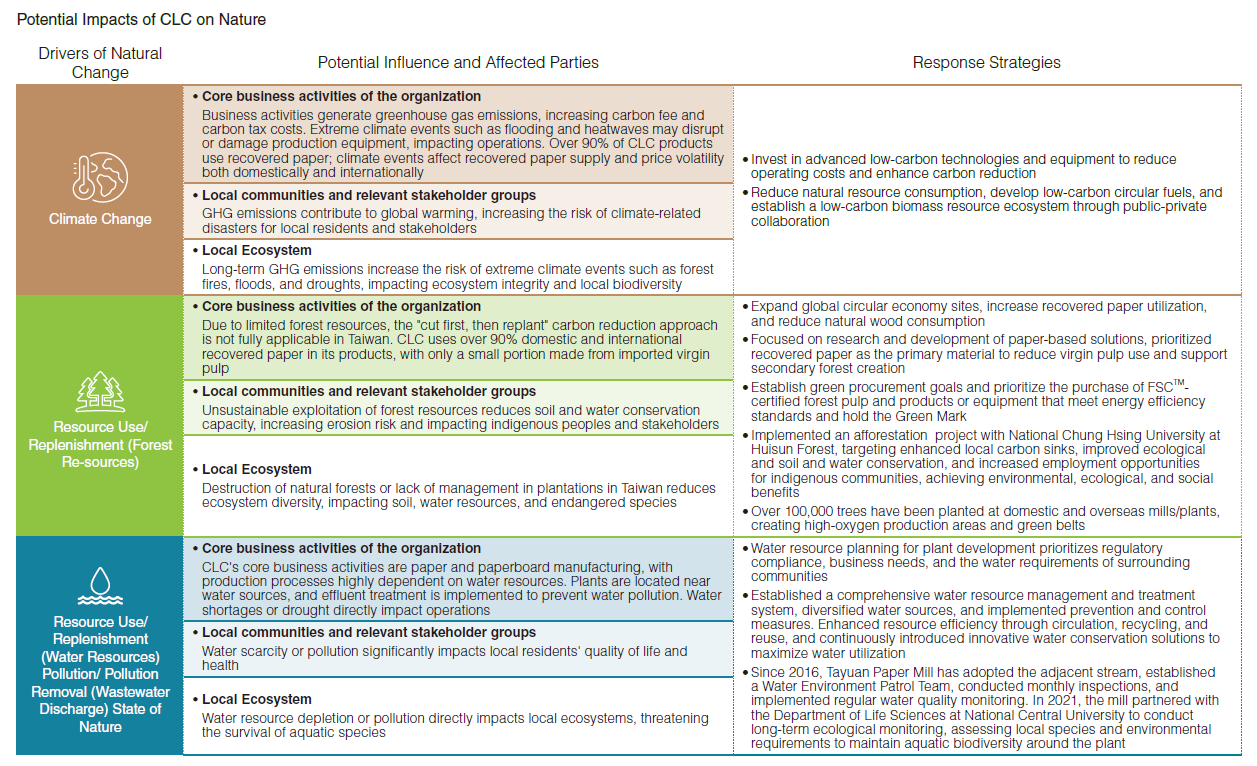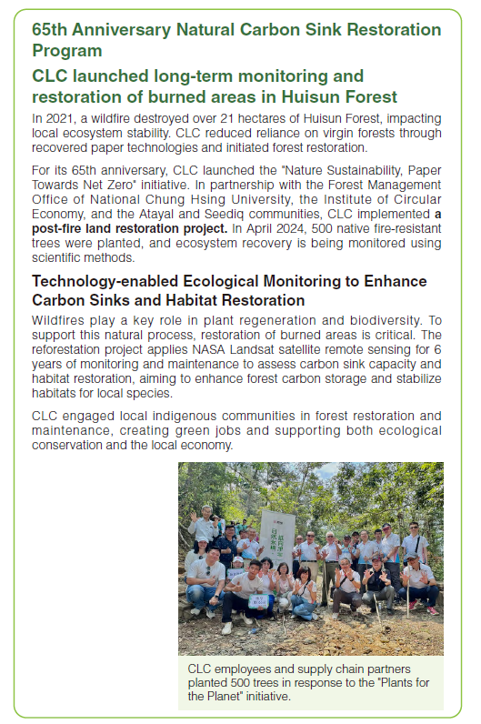 CLC advanced the Nature Positive Vision in response to climate change and resource limitations. In 2023, CLC signed to support the Taskforce on Nature-related Financial Disclosures (TNFD). In 2024, CLC became the 1st pulp and paper industry in Taiwan to join the TNFD Early Adopters and initiated natural capital risk assessments and strategic planning.