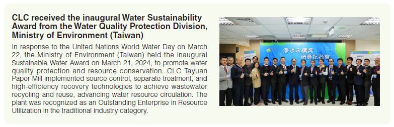 In 2024, CLC invested NTD 392 million in water resource optimization and facility upgrades to further enhance water treatment efficiency upon project completion.