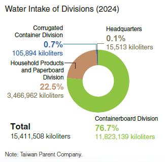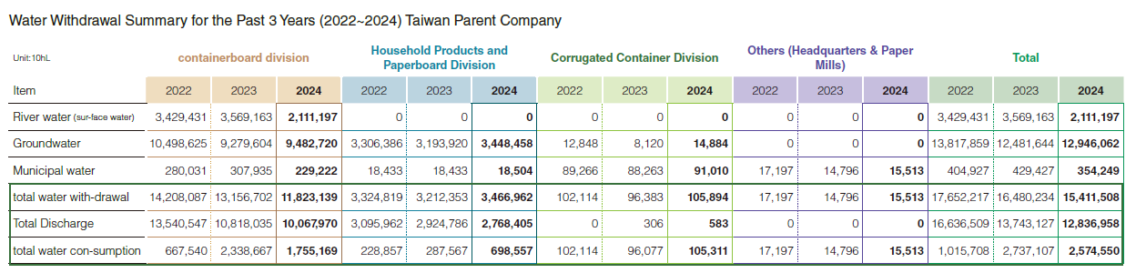 In 2024, the Taiwan Parent Company's total water withdrawal was 15,411 million liters, with surface water and groundwater accounting for 97.7% and tap water 2.3%. This was a decrease of 1,068 million liters from 2023. Total water consumption was 2,575 million liters. Water source management followed Water Resources Agency indicators, and water use was reduced in accordance with government regulations during supply restrictions. CLC's sites in Taiwan, Mainland China, and Vietnam were not located in areas of significant water stress.