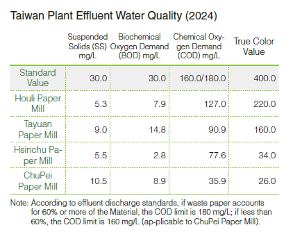All CLC mills/plants are equipped with water treatment systems. The Containerboard and Household Products and Paperboard Divisions use biological treatment and regularly monitor effluent quality to ensure compliance with standards, and continue to implement the wastewater plant QC-Recorder to optimize water treatment operations. The Corrugated Container Division applies physical and chemical treatment and recycles treated wastewater for process rinsing and starch preparation, significantly reducing water consumption.