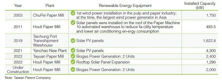 CLC installed wind, solar, and biogas renewable energy facilities based on each plant's geographic and production characteristics. By 2022, total renewable energy installed capacity in Taiwan reached 12,056 kW, nearly double that of 2020. In 2023, Houli Paper Mill expanded solar installations and launched a biogas project. ChuPei Paper Mill and Houli Paper Mill achieved the regulatory requirement for major electricity users ahead of schedule, reaching 10% renewable energy installed capacity before 2025 to accelerate low-carbon transition.