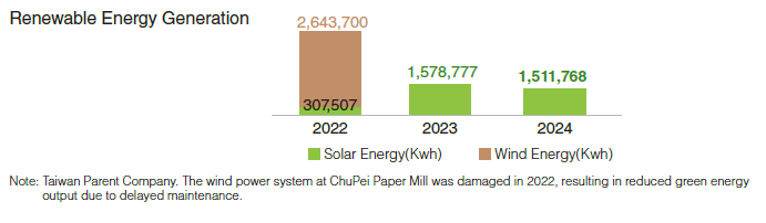 Since 2003, CLC has expanded renewable energy adoption, becoming the first paper company in Taiwan to obtain wind renewable energy certificates in 2017 and the only one to hold both wind and solar renewable energy certificates after acquiring solar certificates in 2023. The wind power system at ChuPei Paper Mill was damaged in 2022, limiting green energy output due to delayed repairs, but was restored in March 2025. As of the end of 2024, CLC had obtained 11,927 wind renewable energy certificates and 2,160 solar renewable energy certificates, totaling 14,087 certificates, equivalent to the annual electricity consumption of 3,913 households (based on Taipower's average monthly household electricity consumption of 300 kWh), demonstrating progress in low-carbon transition.