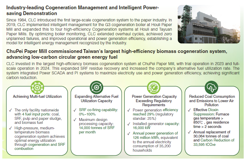 CLC implemented the ISO 50001 energy management system across all mills/plants, established energy management mechanisms, and regularly reviewed energy efficiency and energy-saving targets. To meet the annual 1% energy-saving commitment, each mill/plant developed specific energy-saving plans, including high-efficiency cogeneration systems, renewable energy installations, and equipment optimization. Smart systems were introduced to enhance carbon reduction performance and support the transition to a new low-carbon & green energy paper company.