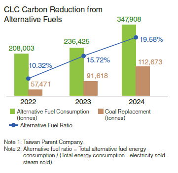 CLC's Taiwan Parent Company set a 25% alternative fuel ratio target for 2030. In 2022, the Climate Change and Circular Economy Office established the Agroforestry Material Resource Utilization Taskforce to lead R&D on alternative fuel technologies and circular resource utilization, ensuring stable domestic and international agroforestry residual material supply and supporting the development of a sustainable biomass material supply ecosystem. Vietnam Binh Duong Paper Mill set a medium- and long-term target of 15% alternative fuel use to reduce fossil fuel consumption.