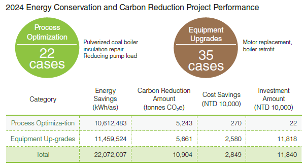CLC enhanced energy efficiency by utilizing ISO 50001 energy management, intelligent controls, and cross-plant benchmarking to optimize paper machine operations. In 2024, CLC invested NTD 118.23 million in 57 energy-saving projects, including process improvements, equipment upgrades, and energy management. These initiatives saved 22,072,007 kWh of electricity (79,458.34 GJ), reduced CO2e emissions by 10,904 tonnes, and lowered energy costs by NTD 28.49 million. From 2013 to 2024, CLC completed 537 energy-saving projects, achieving cumulative electricity savings of 127,970,000 kWh and carbon reduction of 88,241 tonnes CO2e.