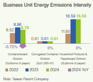 In 2024, the energy emission intensity of the containerboard division decreased by 0.72% to 8.79 GJ/tonne of paper. The Household Products & Paperboard Division and Corrugated Container Division maintained energy emission intensities at 16.59 GJ/ tonne of paper and 0.61 GJ/ thousand m², respectively. Unit product energy consumption decreased by 1.91% compared to the 2019 baseline, falling short of the 5% reduction goal due to increased energy use from market demand and equipment commissioning. CLC will continue to optimize equipment and processes to reduce energy consumption.