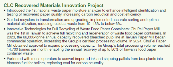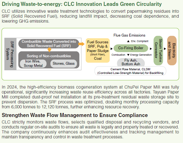 CLC advanced circular economy by converting process residues into resources and expanding the reuse of waste paper mixtures and co-combustion ash. In 2024, waste reuse reached 334,099 tonnes, raising the waste-to-resources ratio to 97.8%, up 1.9% from last year and surpassing the 97% annual goal. Vietnam Binh Duong Paper Mill achieved a 98.7% waste-to-resources ratio and set a medium- and long-term goal of 95%.