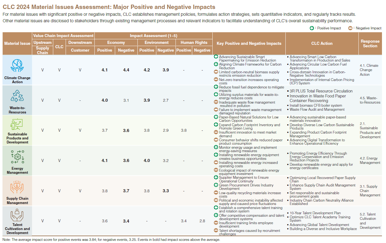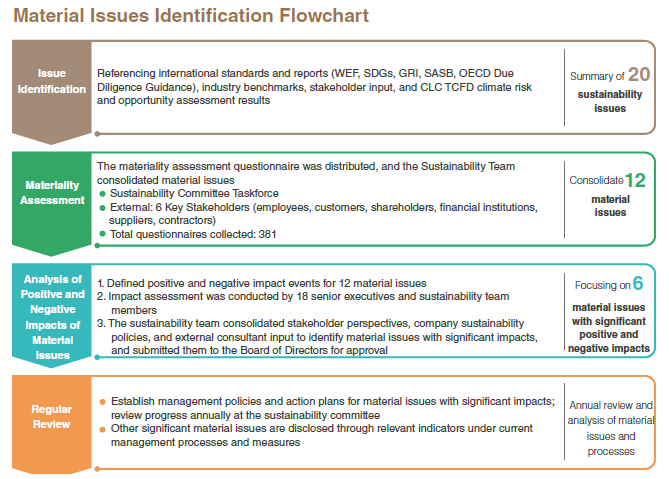 CLC collected stakeholder and expert feedback, reviewed and adjusted stakeholder categories and concerns, and in 2024 issued a material issue identification questionnaire to internal and external stakeholders to evaluate 20 sustainability topics. Topics with significant impact on both CLC and the economy, environment, or people were defined as material issues. The Sustainability Task Force consolidated these into 12 and developed a materiality matrix. The sustainability team and external consultants identified positive and negative impact events for these material issues across economic, environmental, and social (including human rights) dimensions. Senior management and the Sustainability Taskforces assessed the scale, scope, impact, and likelihood of each event, considering financial or operational benefits for positive impacts and potential financial loss or operational disruption for negative impacts. The sustainability team integrated stakeholder input, company policy, and consultant advice to focus on 6 material issues: climate change action, energy management, waste resource utilization, sustainable products and development, supply chain management, and talent cultivation and development. The material issues identification and impact analysis results were submitted to the Board of Directors for approval.