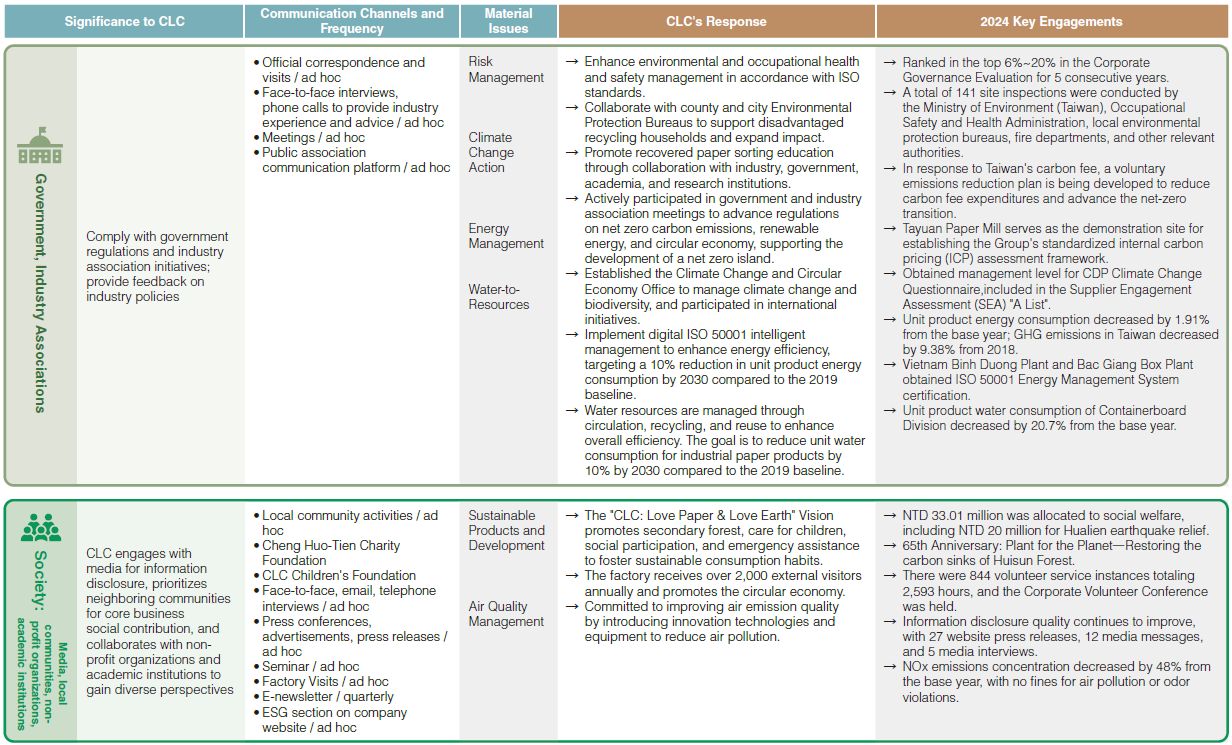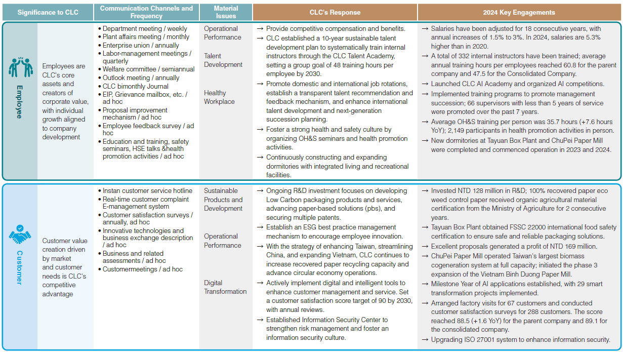 CLC's senior management and the sustainability committee Taskforce annually identify stakeholders and material issues, following GRI Standards (2021) and the EU Double Materiality principle to determine issues with significant impacts on both CLC and external economic, environmental, and social factors. Stakeholder scoring references the AA1000 Stakeholder Engagement Standard 2015, applying the principles of dependency, responsibility, tension/concern, influence, and diverse perspectives. The Taskforce conducts interviews with the Chairperson, President, and management, and completes stakeholder identification questionnaires to identify six main stakeholder groups: employees, customers, shareholders/investors/financial institutions, suppliers/contractors, government/industry associations, and society (media, neighboring communities, non-profit organizations, academic institutions). CLC engages these stakeholders through multiple channels, both regularly and as needed, to gather expectations and inform sustainability issue and impact assessments. The 2024 materiality identification process, analysis, and results are as follows: