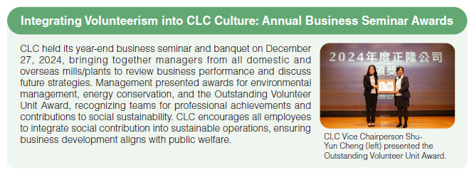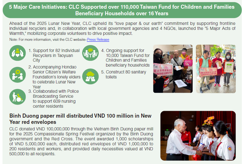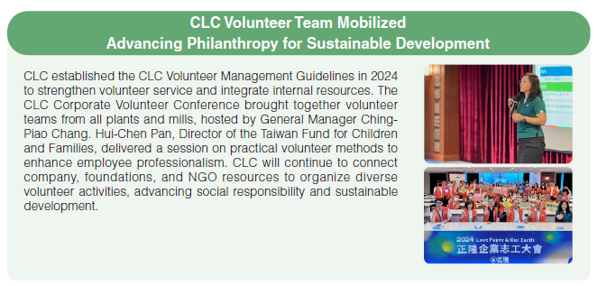 In 2024, CLC collected 4,625 tonnes of recovered paper through sorting campaigns, cleanups, and tree planting at each mill/ plant, with a total of 8,939 tonnes accumulated from 2020 to 2024. CLC has also adopted and maintained 80 public restrooms, supplied eco-friendly toilet paper, and received recognition from Taichung City Government. Tayuan Paper Mill established a water patrol team for stream cleanups and has adopted a river since 2016, receiving a certificate of appreciation from Taoyuan City Government. Hsinchu Paper Mill partnered with Hsinchu City Government to enhance water patrols by donating sun hats and rain boots.