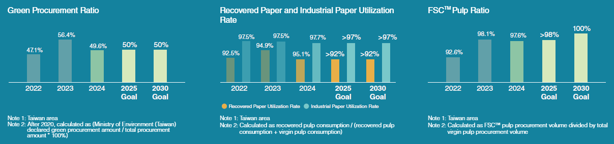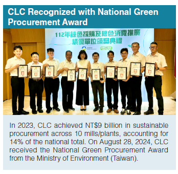 CLC set a long-term goal for green procurement to reach 50% of total procurement by 2030. In 2024, green procurement totaled NTD 8.5 billion, accounting for 49.6% of total procurement (-6.8% YoY). The decline was primarily due to market-driven reductions in virgin pulp procurement. Despite this, CLC remains a leading performer in green procurement, and will continue to advance low-carbon procurement and strengthen the sustainable supply chain.