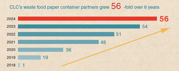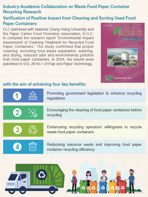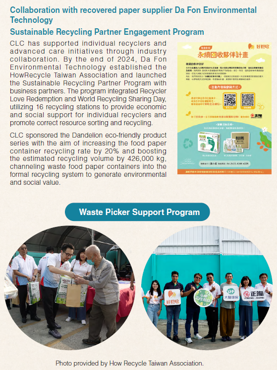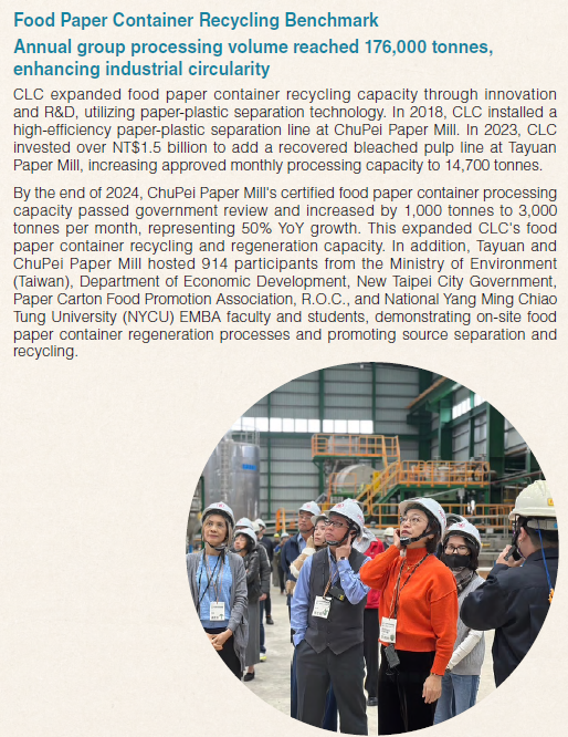 As the largest recovered paper processor in Taiwan, CLC has made circular economy a core strategy. In response to the long-standing issue of 10–13% domestic waste contamination in locally collected recovered paper which compromises recycling efficiency and increases energy consumption during processing, CLC has, since 2018, assisted 167 recycling partners to improve recovered paper quality and meet international standards. In 2024, CLC launched the Food Paper Container 2.0 Project, training key regional partners and supporting 56 suppliers to optimize food paper container sorting and processing, enhancing the local recovered paper supply chain.