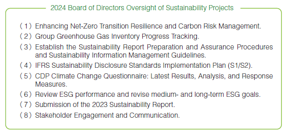 Sustainable Development Governance StructureThe CLC Board of Directors serves as the highest decision-making and supervisory body for sustainable development, annually reviewing sustainability project progress, management policies, and execution through reports from the sustainability committee and its executive secretary. The sustainability committee oversees 7 taskforces: Corporate Governance and Integrity, Environmental Sustainability, Employee Care, Supply Chain Management, Industry Services, Social Inclusion, and Information Security. Each taskforce comprises first-level supervisors and senior staff from relevant departments, with ESG responsibilities assigned by function and extended to subsidiaries. The committee established the Climate Change and Circular Economy Office, led by the President and the R&D supervisor as deputy, and consults external experts, including the Taiwan Green Productivity Foundation. The taskforces hold monthly meetings to track progress and effectiveness, reporting quarterly to the Board. The Board arranges annual corporate sustainability training for directors.