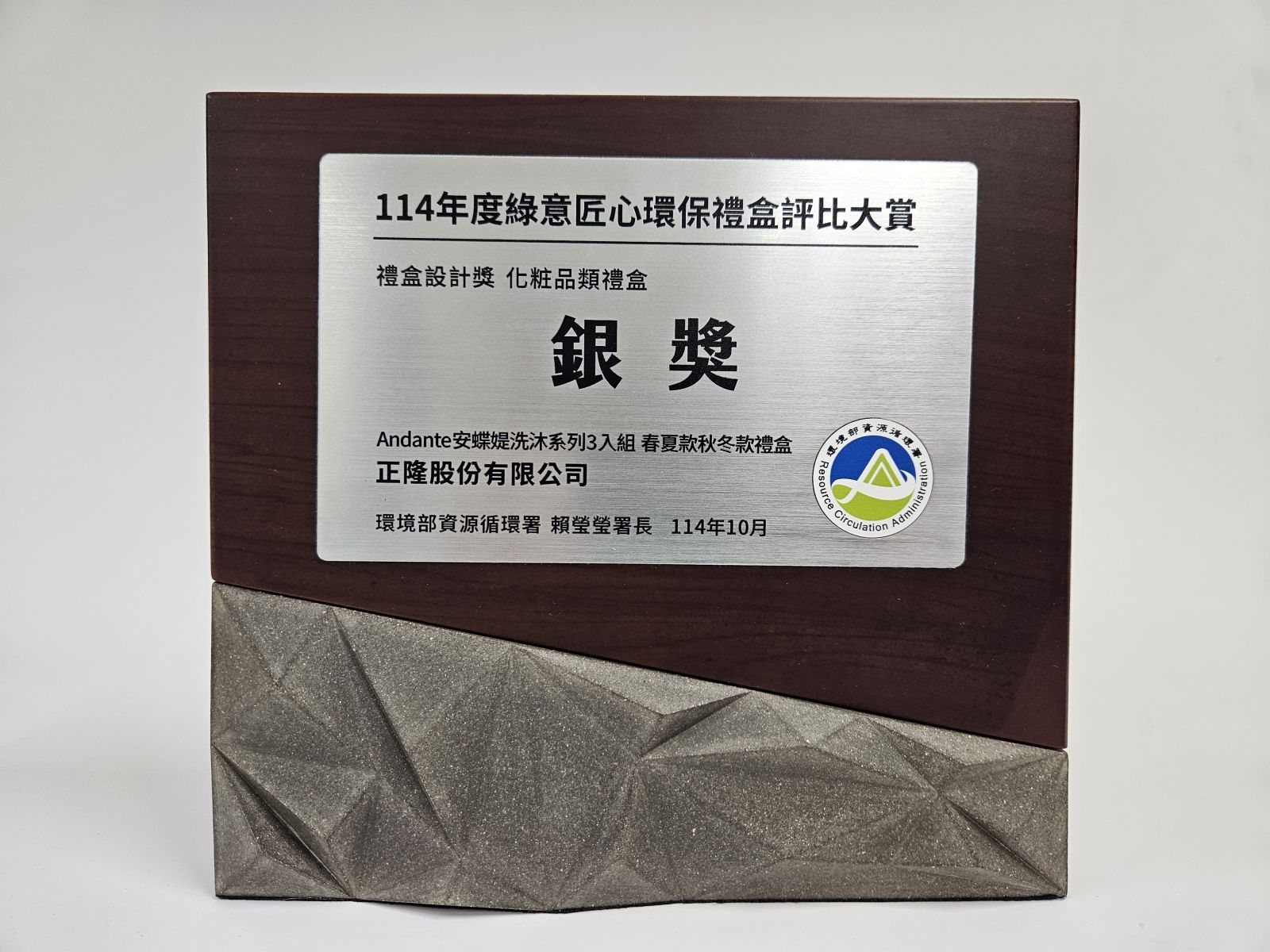致力將「資源循環」的永續理念從工廠製程延伸至產品設計的正隆公司,再度以創新包裝設計展現循環美學。由正隆研發處包裝設計課打造的「Andante安蝶媞洗沐系列3入組春夏款、秋冬款禮盒」,憑藉簡約結構與完全可再生利用的設計,榮獲環境部資源循環署「綠意匠心環保禮盒評比大賞」銀獎。