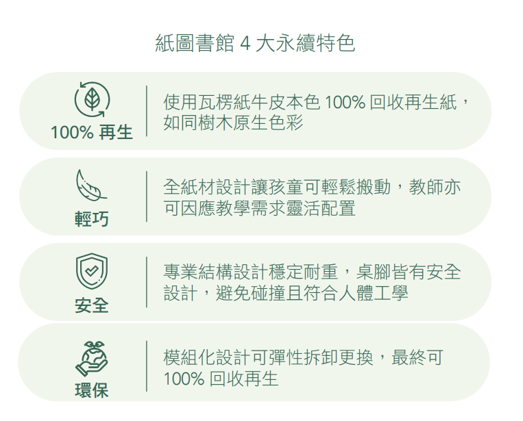 - 打造友善閱讀空間:以紙構築溫潤、安全又具創造力的學習場域,鼓勵孩子主動探索。