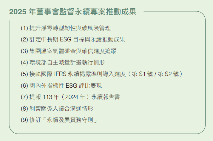此外,委員會另設置「氣候變遷暨循環經濟辦公室」,由總經理擔任召集人、研發主管擔任副召集人,統籌推動氣候風險調適、減緩及低碳轉型相關行動,並積極諮詢外部專業機構。為提升董事永續管理專業並持續更新知識,董事會每年均安排董事參與企業永續相關課程進修。