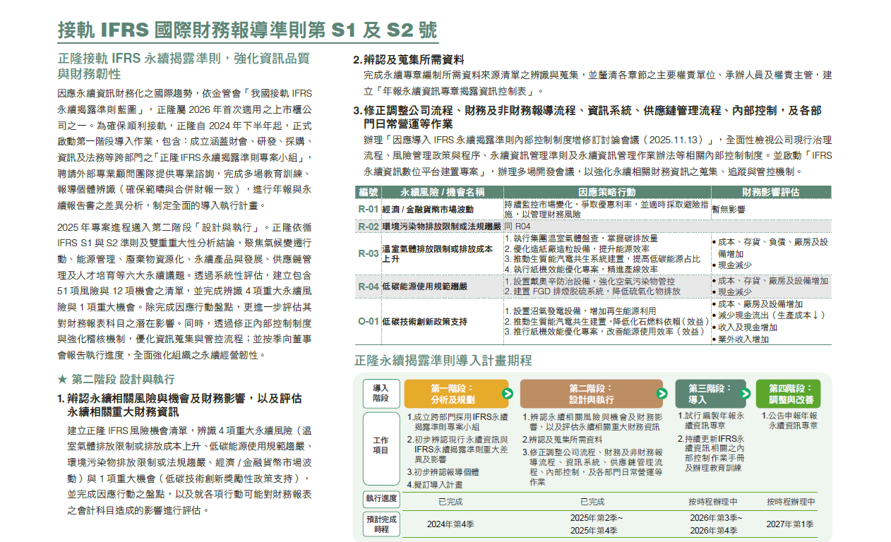 在執行層面,正隆設置「永續發展部」為專責單位,並由該部主管擔任企業永續委員會執行秘書,負責統籌相關事務。委員會下亦設有七大工作推行小組,包括公司治理暨誠信經營、環境永續、員工關懷、供應鏈管理、產業服務、社會共融及資訊安全,由各部門一級主管及資深同仁組成,推動ESG業務並擴及集團子公司。小組每月追蹤執行成果,並由執行秘書彙整後每季提報董事會,以供督導與決策。